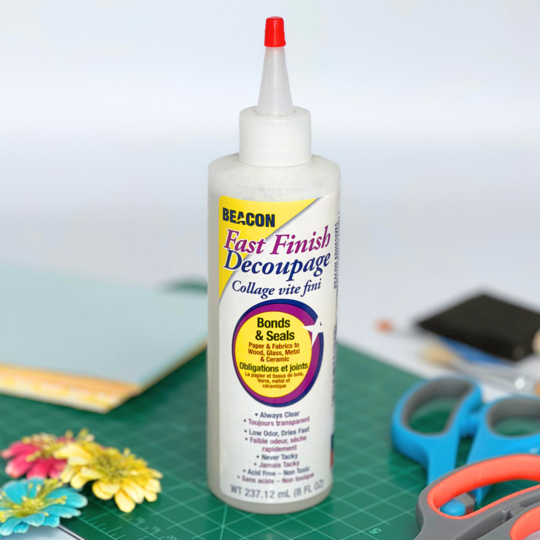 Fast Finish Decoupage is a perfect decoupage medium for almost any surface–wood, plastics, metal, cardboard, glass, ceramics, terra cotta, paper mâché, & so much more. Excellent for applying most papers, decorative napkins, tissue paper, color copies of photographs, etc. This product is great for making home décor and gift items such as jewelry boxes, picture frames, decorative plates, vases, pottery, candlesticks, and many other items.