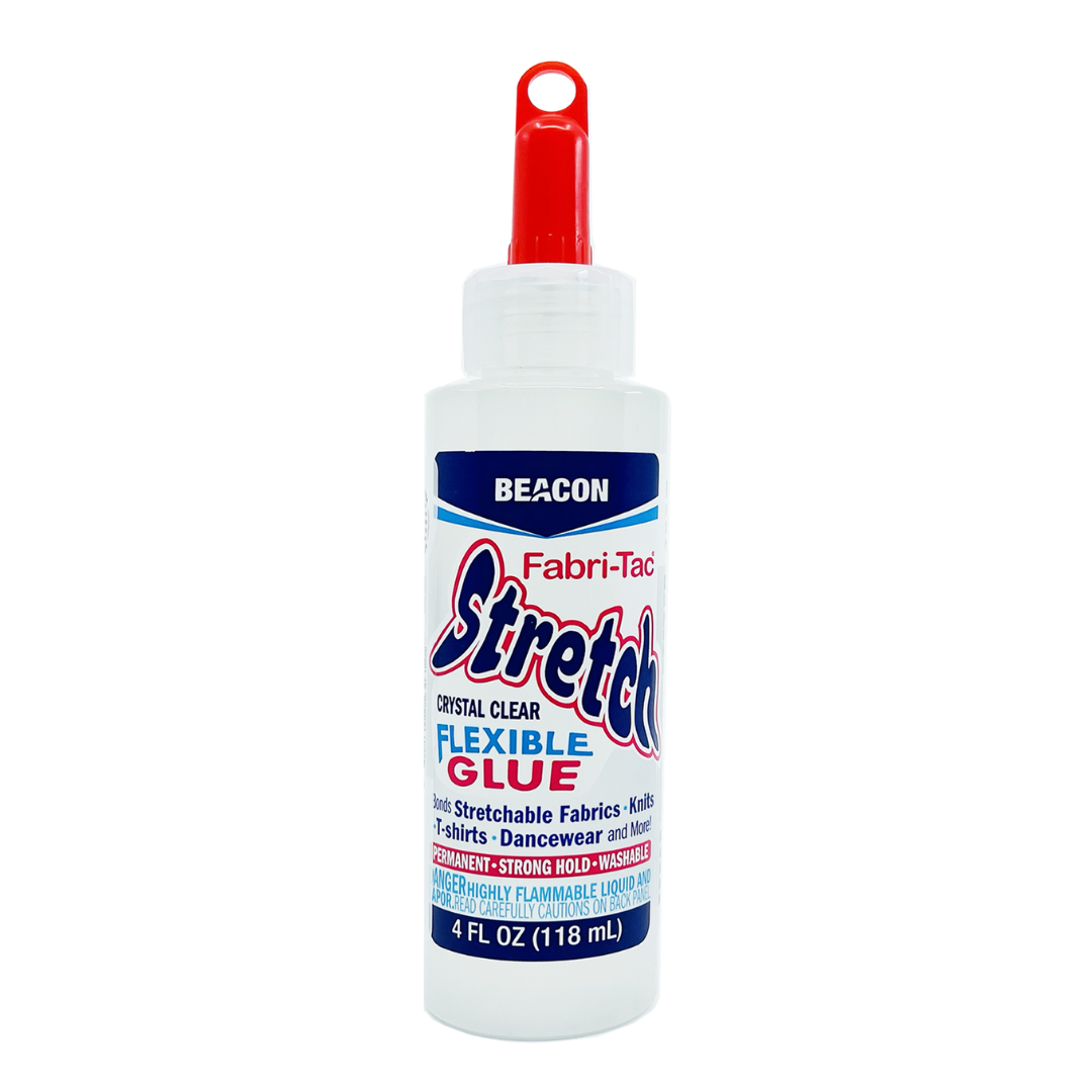 Fabri-Tac® STRETCH Glue NEW STRETCH & FLEXIBLE Fabri-Tac® formula. It bonds stretchable fabrics, knits, dance wear,and more. It grabs fast, dries crystal clear and holds strong and permanently. It stays stretchable even after machine washing and drying. The Fabri-Tac® STRETCH Glue formula is a premium quality fabric glue won’t soak into fabrics and is much easier to use than a glue gun as there is no heat or inconvenience. Fabri-Tac® is trusted by fashion designers and loved by many!