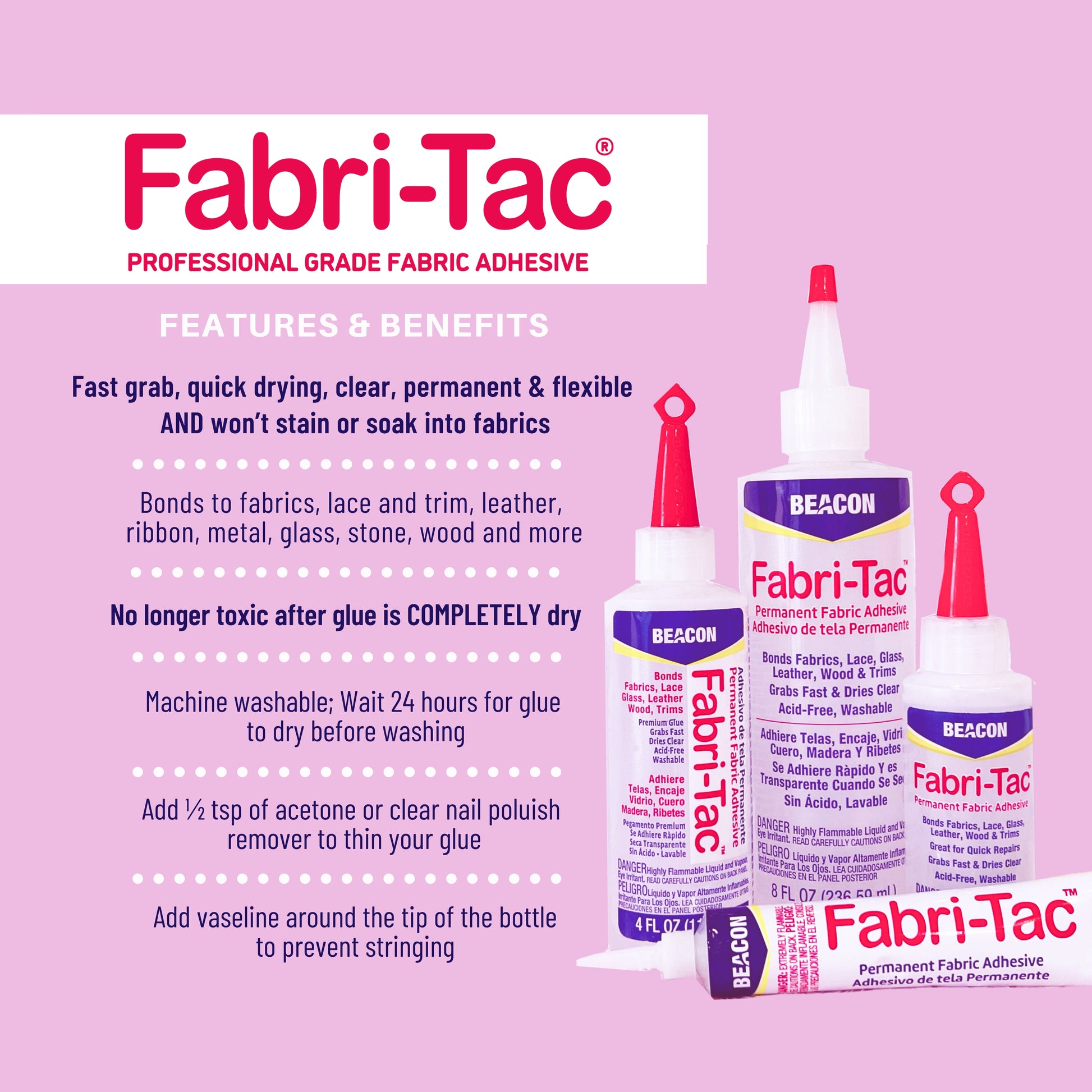 Fabri-Tac® is a premium quality fabric glue and has been a favorite among professional designers for decades. This adhesive won’t soak into fabrics and is much easier to use than a glue gun as there is no heat needed. Fabri-Tac® is trusted by fashion designers and loved by many! Used in the wedding industry, costume design, fashion, competitive dance wear, and numerous other areas of fabric fashion! Fabri-Tac® is also great for practical use, from a quick hem to clothing repairs, this glue will quickly become a household staple.