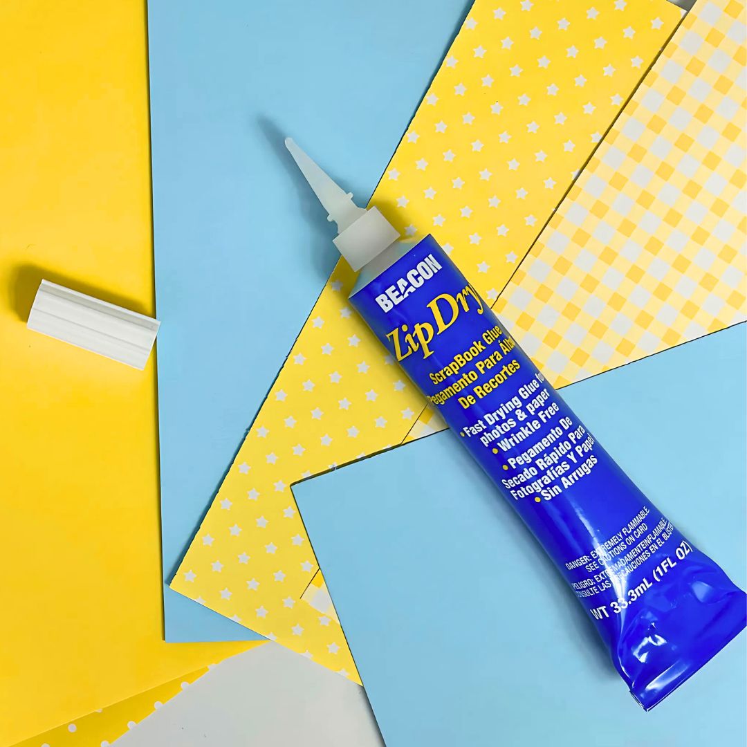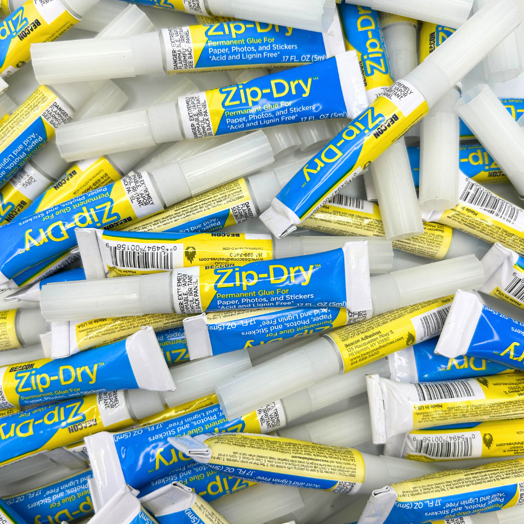 Zip Dry is a premium paper glue with archival quality. It is acid and lignin free for scrapbooks, photo albums, cards, and more. This adhesive will never wrinkle, even tissue or vellum. It is strong enough to bond metal, wire, glitter, beads, buttons and more.